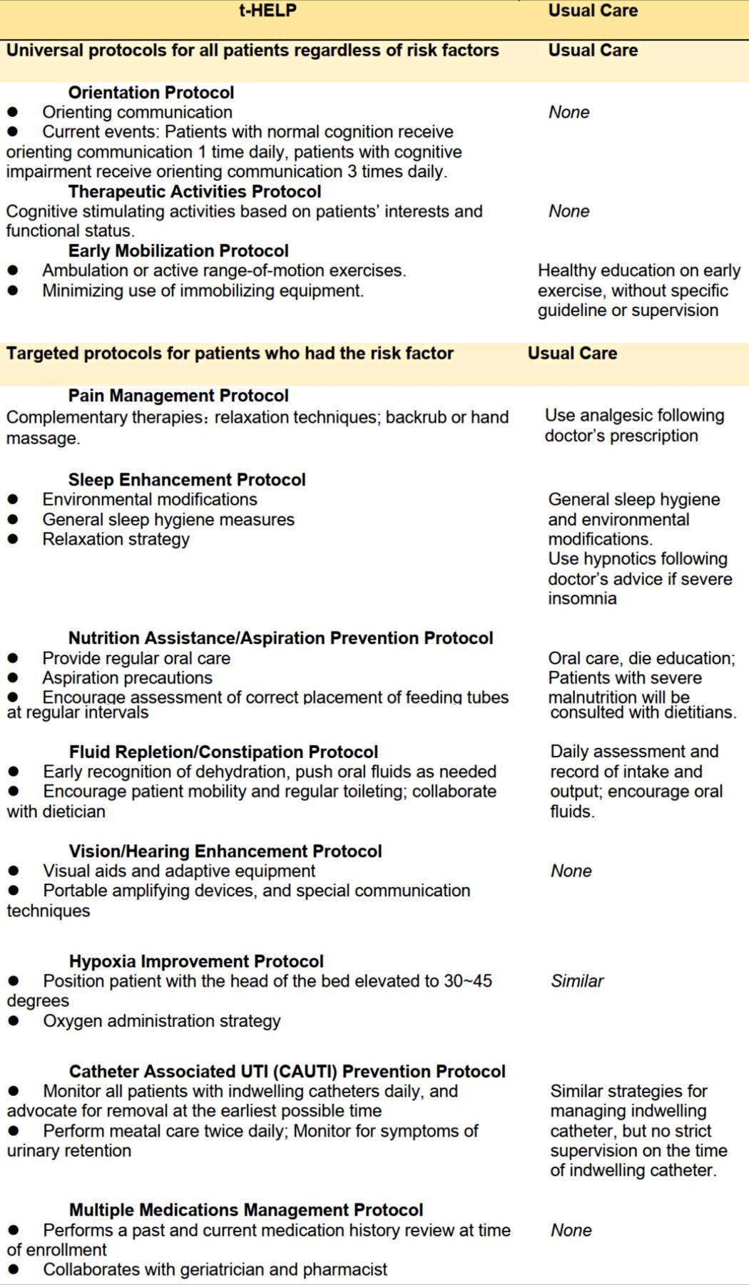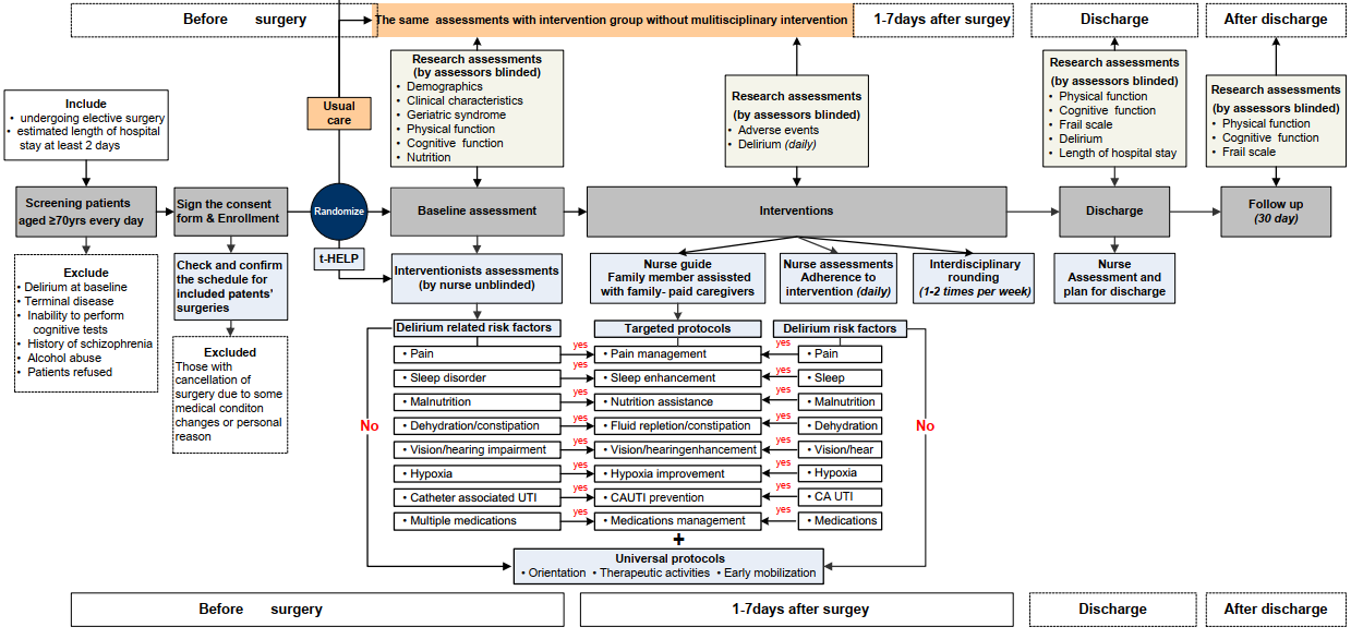 Postoperative delirium (POD) is one of the most common complications for older patients, which is associated with serious adverse outcomes, including increased length of hospital stay (LOS), mortality, risk of functional decline, and subsequent dementia. Previous studies have demonstrated that 30% to 40% of these cases are preventable. Currently, multicomponent non-pharmacological interventions are considered the first-line approach for delirium prevention. Among these approaches, the Hospital Elder Life Program (HELP) is the most widely implemented evidence based model that targets multiple risk factors for delirium. In 2013, HELP protocols were adapted to align with the National Institute for Health and Care Excellence (NICE) guidelines. In this study, they implemented a total of 11 protocols, comprising the original 6 volunteer-based HELP protocols, 2 original nursing-based HELP protocols, and 3 NICE guideline-adapted protocols. Furthermore, they tailored the protocols to address each patient’s risk factor profile so that each patient received a customized menu of interventions. To implement the program at their hospital, they adapted HELP to the Chinese culture. The innovation in this present study was called t-HELP (tailored, family-involved HELP), which involved family members instead of volunteers and applied a tailored approach to assigning HELPprotocols. The overarching rationale for the trial was to adapt HELP to local circumstances in China and demonstrate its effectiveness in a different health care system.
