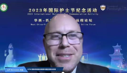 Mr. Jeff Bernstein delivered a welcome speech on the forum. He expressed his congratulations to both schools for jointly hosting the Nursing Development Forum for three consecutive years since 2020, pointed out that nursing plays a crucial role in the high-quality development of medicine, and expected both schools making greater contributions to let the voice of nurses be heard. Mr. Jeff also expressed that UPMC would actively promote cooperation and exchange in multiple fields between two schools!