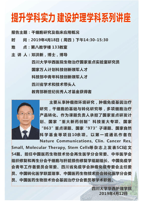 2019年4月18日讲座预告——“干细胞研究及临床应用概况”