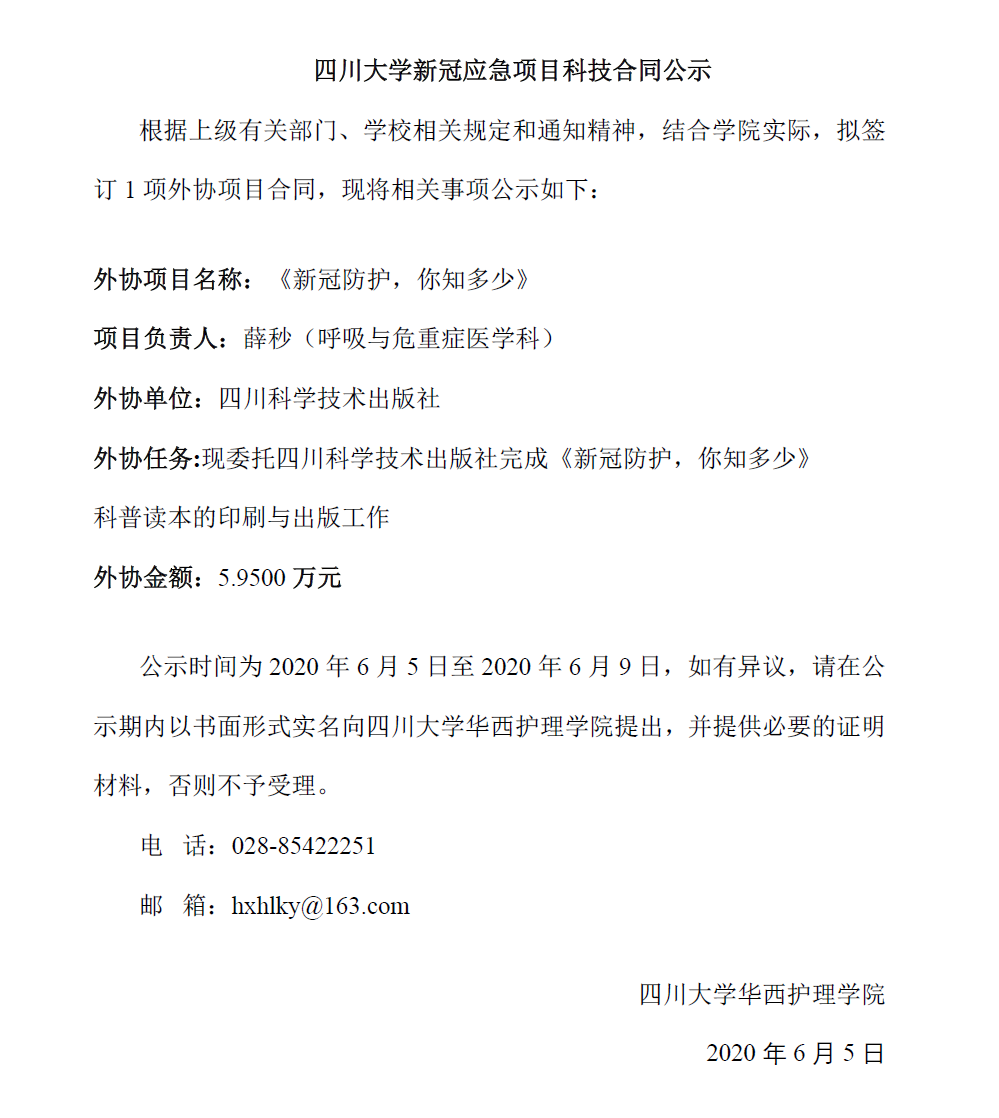 根据上级有关部门、学校相关规定和通知精神,结合学院实际,拟签订1项外协项目合同,现将相关事项公示如下:外协项目名称:新型冠状病毒肺炎防控护理虚拟仿真实验教学项目项目负责人:李卡外协单位:成都泰盟软件有限公司外协任务...