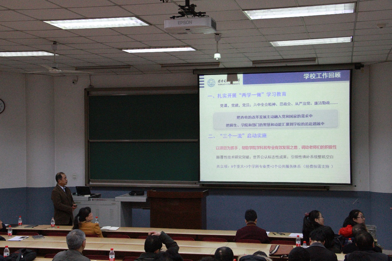 随后,仇原鹰回顾总结了2016年度学院各项工作取得的成绩,通过详实的数据分析对比,指出了学院目前存在的主要问题,并提出了相应的对策,安排部署了2017年学院重点工作:一是深入学习贯彻落实全国高校思政会和十八届六中全会精神,着力做好党建和师生思想政治工作;二是大力推进一流学科建设工作;三是扎实做好本科教学审核评估工作;四是积极推进工程教育专业认证工作;五是全力做好研究生学位授权点增列工作;六是完成新一轮岗位聘任,重点做好高层次人才队伍引育工作;七是积极配合学校办好“互联网+”大赛;八是进一步加强学院文化建设。