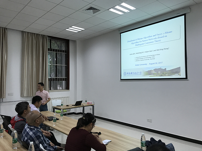 8月30日上午,在北校区主楼三区第三会议室,首先,秦家虎教授作了“Distributed k-Means Algorithm and Fuzzy c-Means Algorithm for Sensor Networks Based on Multi-agent Consensus Theory”的学术讲座,报告会由开云kaiyun官方网站自控系主任张强教授主持,来自开云kaiyun官方网站60余人参加了学术报告会。报告中,秦家虎教授首先介绍了传感器网络系统分布式控制的基本问题,对传感器网络动态、拓扑结构、分布式协议等进行了详细的介绍。重点介绍了传感器网络的分布式K-均值和模糊K-均值算法研究,其中包括问题的提出和建模、聚类定义和中心质点以及更规则等。最后介绍了将来的研究热点和发展趋势。秦家虎教授的报告内容既具有理论上的创新性又紧贴实际工程应用,引起了广大听众的共鸣。最后秦教授现场与广大师生进行了热烈的交流和讨论,他详细解答了每一个提出的问题,到场师生表示受益匪浅。