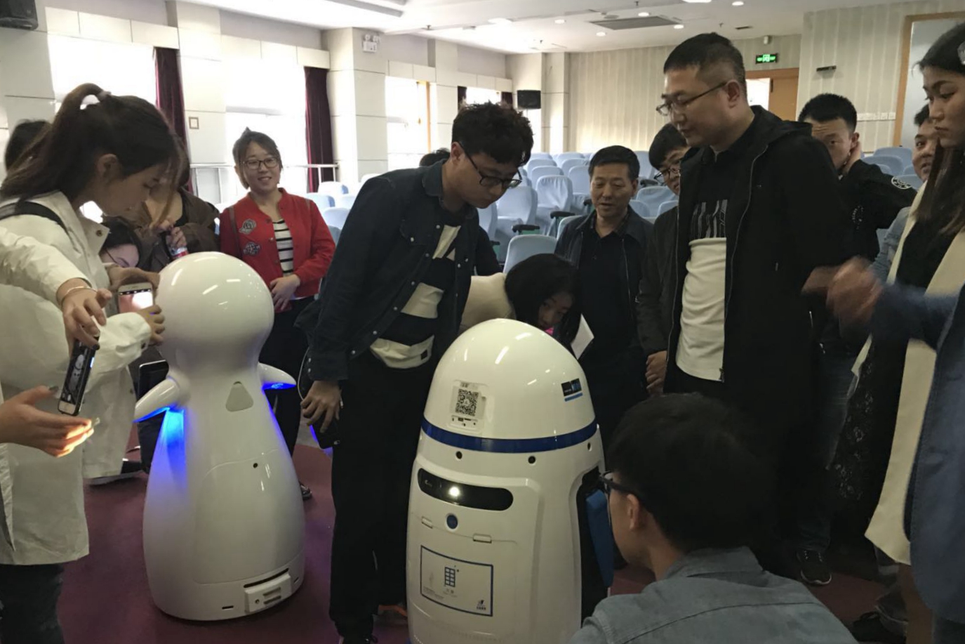 会后,陕西戴菲斯机器人有限公司工作人员现场演示了两台服务型机器人的功能,引起同学们的极大兴趣。