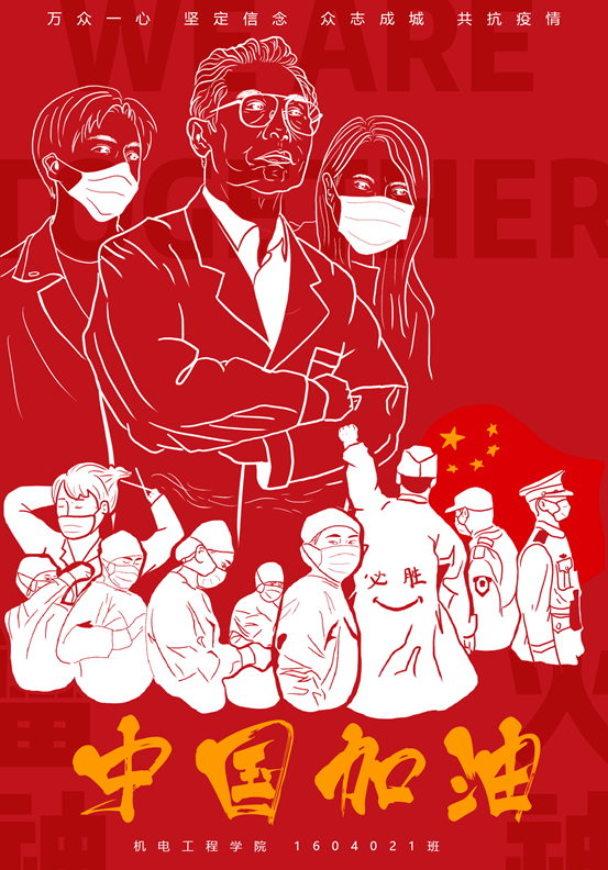 工业设计专业的同学们利用自己所学的专业技能制作了一幅幅抗击疫情为祖国加油的宣传画。同学们一笔一划悉心勾出为武汉加油、为祖国祝福的坚定信念。他们想通过自己制作的宣传画为一线的医护工作者送上祝福,让广大的青年朋友们提振信心,众志成城,战胜疫情。