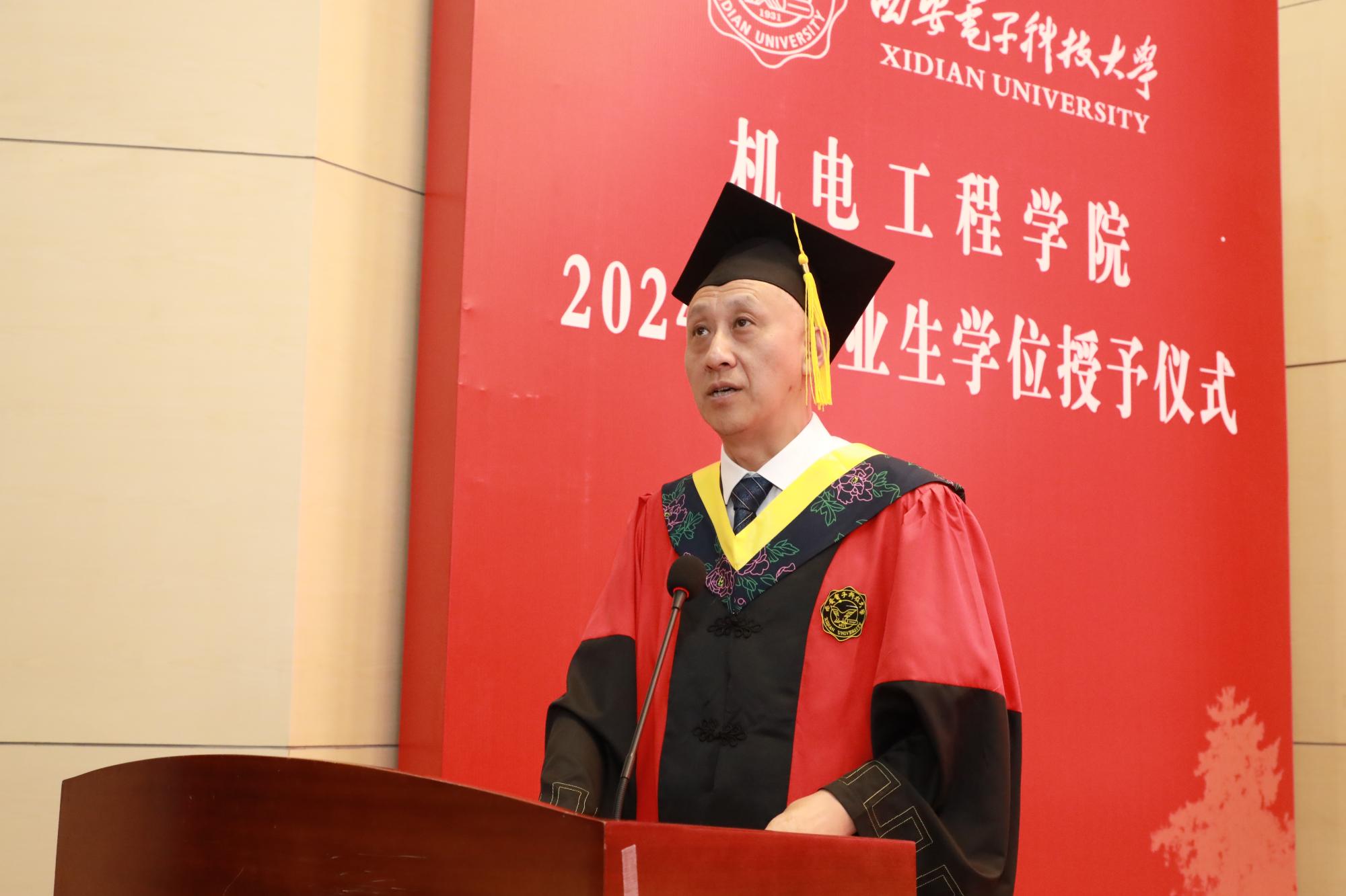 王泉在致辞中代表学校向2024届毕业生致以热烈的祝贺和美好的祝愿,向辛勤耕耘的老师和家长表示崇高的敬意和诚挚的感谢。他表示,非常高兴看到同学们如今斗志昂扬、蓄势待发的精气神及沉甸甸的成绩单,2024届学子用青春汗水铸就了成长的蜕变,用不懈的奋斗换来了丰硕的果实,展现出动人的青春风采,留下了永恒的西电印记。在同学们即将开启崭新人生之际,他对学院全体毕业生提出了三点希望:一是要以信仰之光乘风起航、挺膺担当,在理想照耀下赓续前行。希望同学们心系国家事,肩扛国家责,在祖国的广阔舞台上施展抱负、大展宏图,用脚步丈量祖国大地,让青春在全面建设社会主义现代化国家的伟大实践中磨砺出彩。二是要以创新之志挥桨破浪、踵事增华,在开拓进取中创造未来。创新是蕴含于西电校风中的内涵,更是每一位学子矢志不渝的追求。希望大家用学识才智赋能中国式现代化,奏响开拓创新的时代最强音。三是要以奋斗之姿把舵扬帆、奋楫笃行,在躬行实践中攻坚克难。所谓艰难方显勇毅,磨砺始得玉成。希望同学们能够以乐观豁达的心态面对实践中的艰难险阻,在考验磨砺中汲取经验,踔厉奋发,勇毅前行,以奋斗姿态谱写动人的青春乐章!