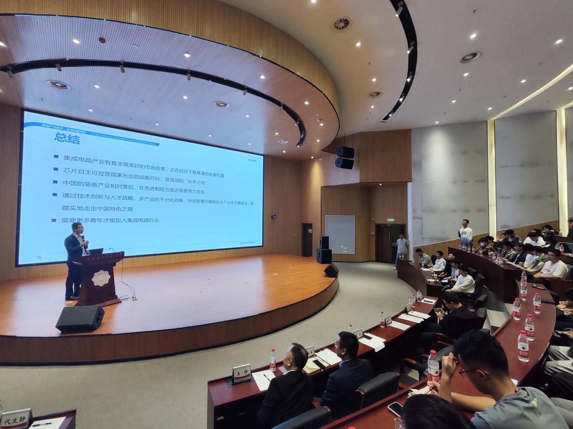 董博宇分别从集成电路技术及产业发展趋势概述、集成电路工艺流程及工业设备介绍、产业发展新形势下北方华创的现状进行了阐述。他指出半导体产业是数字经济的基石,已成为国家构建战略科技力量自立自强的核心支撑产业。芯片制造技术是集材料、设备、工艺的物理极限组合,同时还兼具迭代快、多样化、装备复杂、验证周期长等特点,其正在向先进工艺、特色工艺、先进封装及三维集成三个维度发展,同时人工智能、大数据等应用市场爆发也为产业发展带来了广阔的空间和机会。他鼓励同学们要构建坚实的基础知识,在科研和创新的道路上,不仅要追求卓越,更要勇于面对探索过程中产生的困难和挑战,更加坚定地追求科研的深度和广度,勇攀科技高峰,踊跃投身我国半导体装备行业建设,为中国集成电路装备产业的自立自强贡献自己的一份力量。