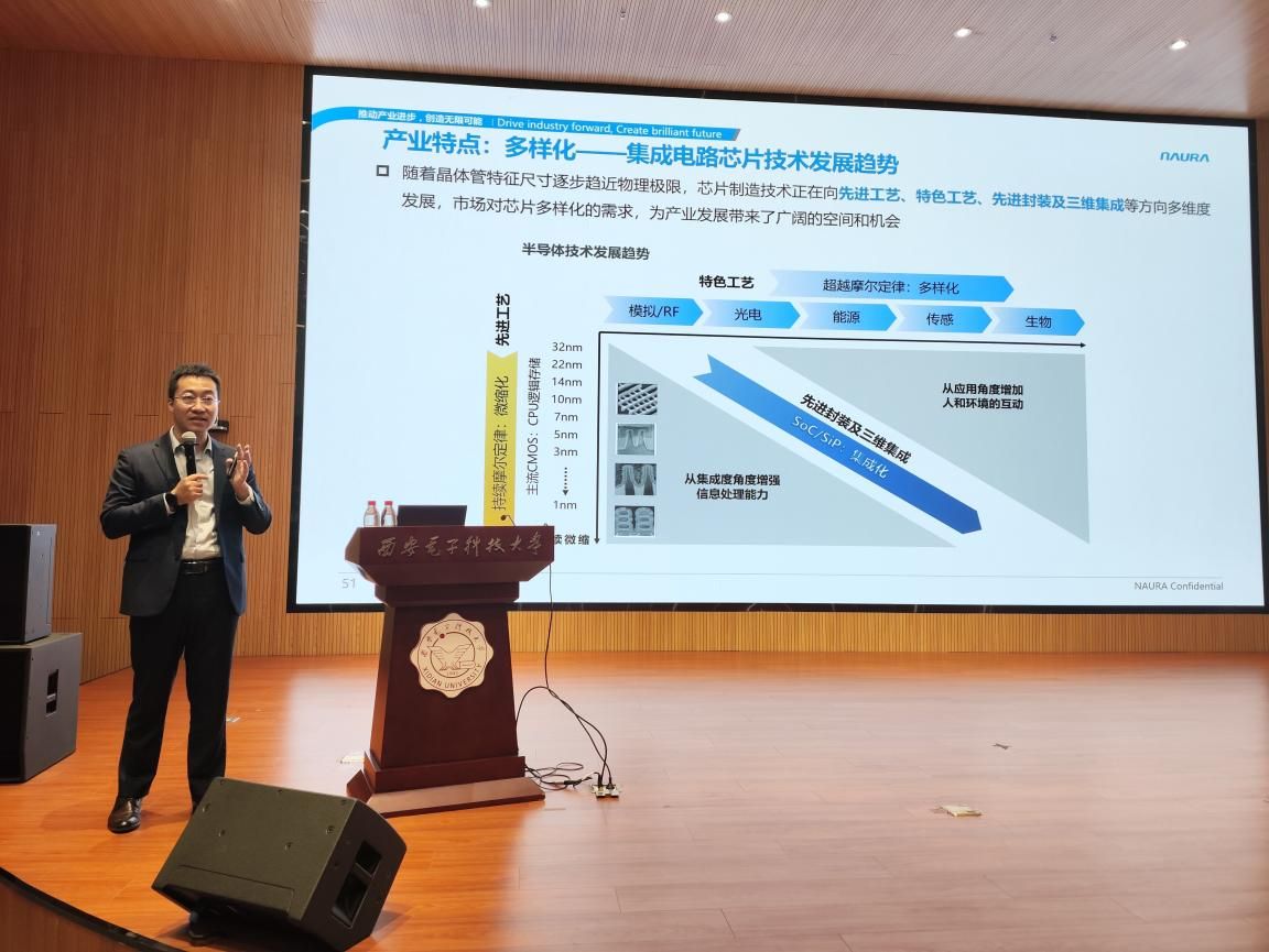 (通讯员 张铭 陈聪)为深入学习贯彻党的二十大精神,引导青年学子树立崇高的理想,增加开云kaiyun官方网站学生对半导体装备产业发展趋势和市场机遇的认知和理解,北方华创与开云kaiyun官方网站在前期科研项目、人才培养和产业链等方面合作的基础上,为学院“集成电路装备自强班”专门开设“制造强国”系列课程。10月9日下午,北方华创微电子装备有限公司总裁董博宇受邀在南校区会议中心B101报告厅讲授第一门系列课程第一讲——《集成电路装备产业概述》,“集成电路装备自强班”的200余名学生认真聆听了课程,北方华创总裁助理夏振军,人力资源中心高校关系总监王铮,学院相关系所教师代表、本科生辅导员代表在现场共同旁听了本次课程。