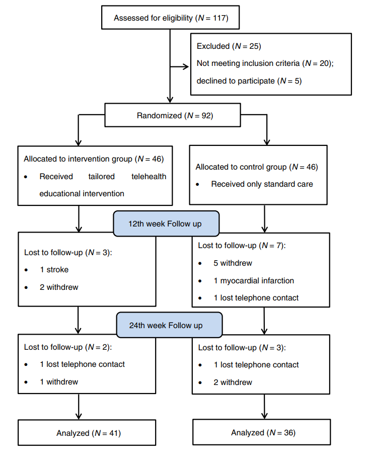 研究对象从四川省成都市三级医院风湿病科招募。纳入标准:(a)根据2010年美国风湿病学会标准(ACR)/欧洲风湿病联盟(EULAR)的诊断分类标准确诊的RA患者;(b)年满18岁;(c)从医院出院回家;(d)能够说并理解中文;(e)愿意参加本研究。排除标准:(a)听力障碍;(b)没有电话设备;(c)严重的认知或精神障碍;(d)参加其他教育类项目。共有117名患者接受了资格评估,排除20名患者不符合纳入标准和5名拒绝参与的患者。因此,92名患者被随机分到干预组(N=46)和对照组(N=46)。15名患者(干预组5名,对照组10名)在24周随访期间失访。最终,干预组41名患者和对照组36名患者完成了这项研究。