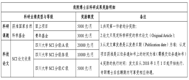 申请成功的博士后将根据申请者背景和兴趣,从事全生命周期全程“护理学+”相关创新科研工作。在站期间待遇、科研业绩要求以及出站后留院要求按伟德国际英国华西医院博士后管理有关规定执行,专职博士后聘期三年,税前年薪20万以上(包含五险一金及各类补贴),聘期内享受我院专职博士后科研业绩奖励(如下表)。