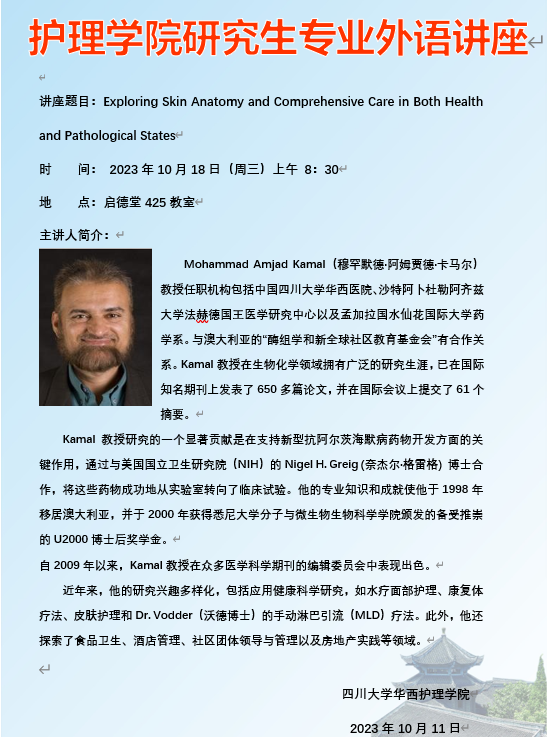 2023年10月18日讲座预告——Exploring Skin Anatomy and Comprehensive Care in Both Health and Pathological States