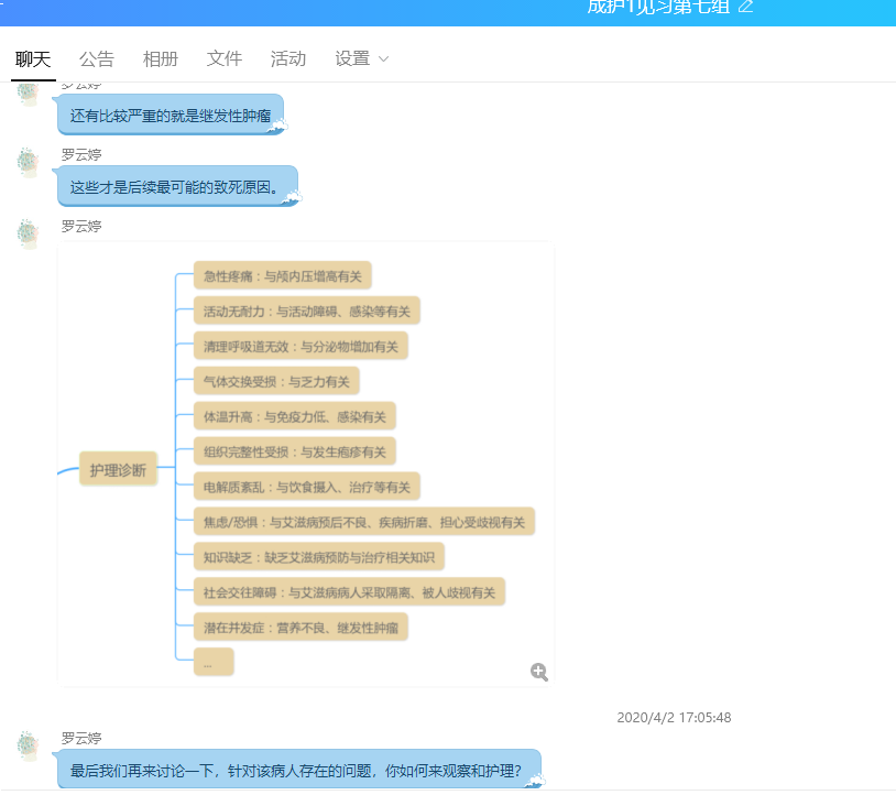 虽然现在没有机会到病房实地学习,但每周线上见习,有来自不同科室的老师带领我们分析临床典型案例,不仅需要我们运用理论课上所学知识,还需要根据实际情况作出及时的反应,把每一章节所学进行融会贯通、熟练掌握。老师们的分析指导告诉我们:每一个病例都有共同点和各自的特点,我们现在学到的单章节不一定就对应每一种疾病的病人,为了更好的护理病人,我们需要不断反省总结,思考每种情况下我们具体应该做的,这样才能获得尽可能好的效果。
