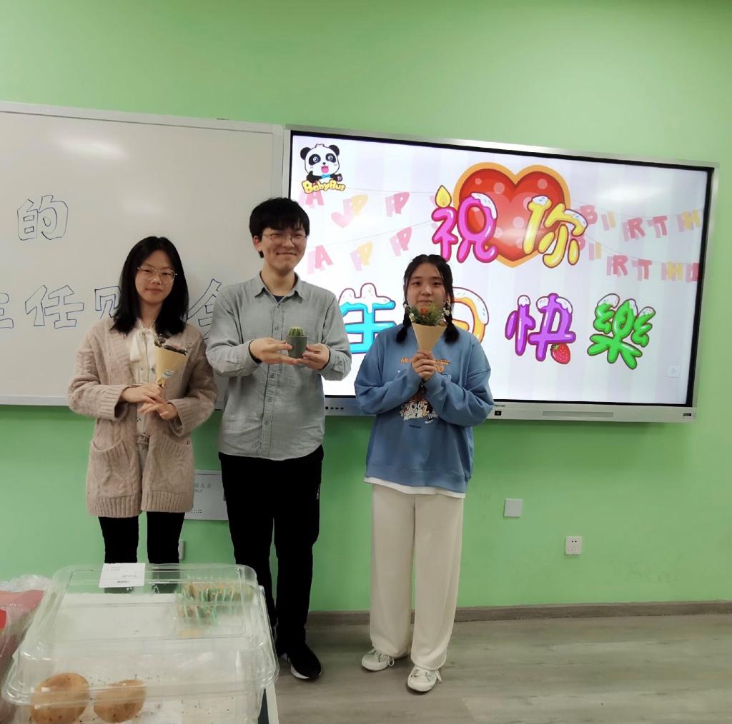 在班会尾声,亲爱的班主任邱老师还为3月份过生日的同学们准备了生日惊喜,送给了同学们精心挑选的鲜花和小盆栽。