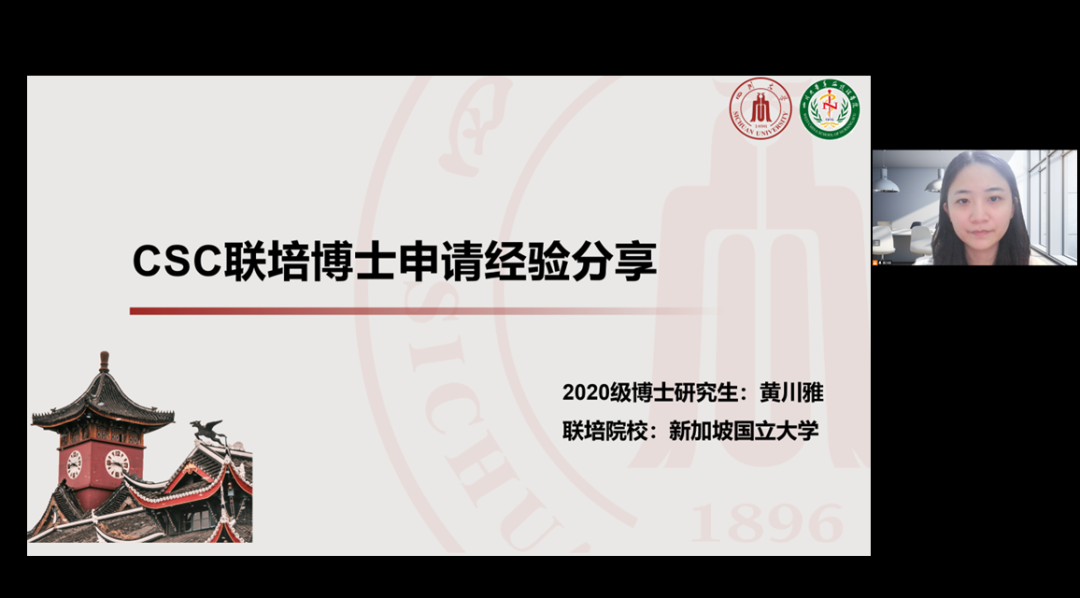 获得国家留学基金委资助,并正在新加坡国立大学访学的2020级博士研究生黄川雅同学带来了“国家留学基金委联培博士申请经验分享”,从自身申请经验出发,介绍了联培博士申请流程、个人简历及申请信、寻找目标院校及导师、联系后续事宜等内容。