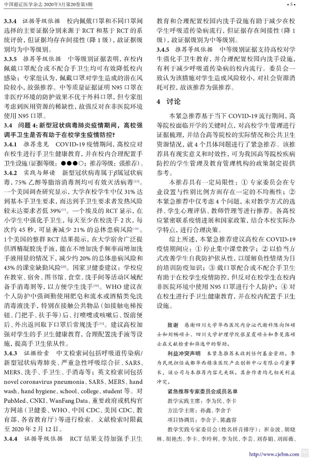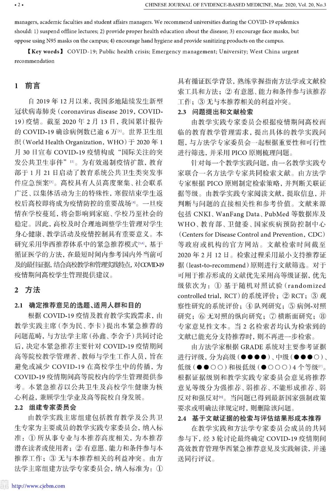 川大华西护理学联合临床医学、教育学、循证医学、公共卫生学等多学科专家采用循证医学方法,结合本次疫情实际情况,就高校疫情防控中的教学管理问题,在《中国循证医学杂志》发布紧急推荐,为新冠疫情防控期间高校学生管理提供借鉴参考!
