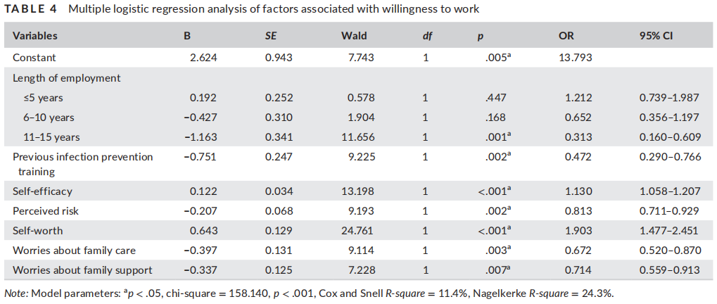 我们建议未来的研究开发一种标准化工具来衡量工作意愿,同时实施随机抽样。此外,在不同文化背景下验证后,我们建议进行混合方法研究,以探索护理人员愿意在一线工作的促进因素和障碍。