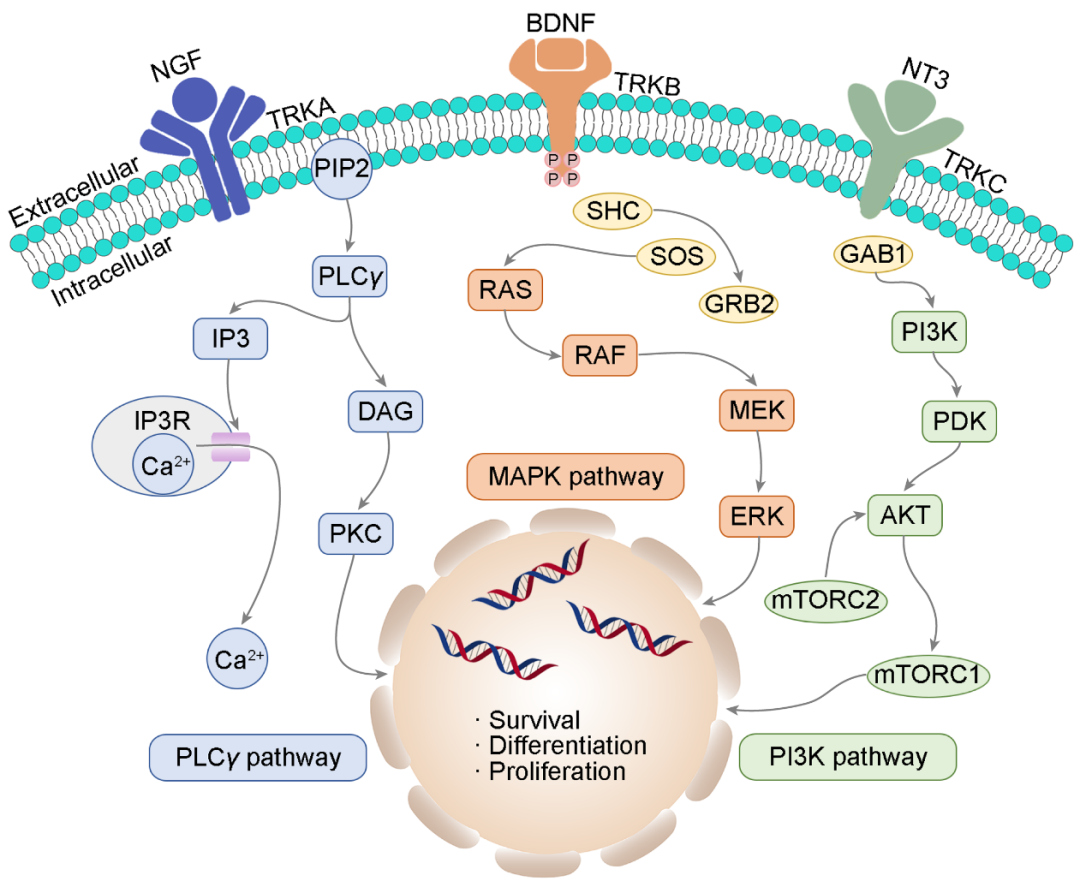 原肌球蛋白受体激酶(Tropomyosin receptor kinases, TRKs)是细胞表面受体酪氨酸激酶(RTK)家族成员,包括TRKA/B/C三种蛋白,它们分别由神经营养受体酪氨酸激酶1/2/3(NTRK1/2/3)基因编码。与大多数酪氨酸激酶相似,TRK激酶在配体-受体相互作用和随后的受体二聚化后发生自磷酸化,从而被激活。活化的激酶触发下游信号转导途径,导致细胞增殖,分化和存活。目前已经发现TRK蛋白可以激活多种信号通路(图1)。此外,还有其他方式也能激活TRK下游信号通路的关键途径,例如,在结肠癌KM12细胞中,TPM3-TRKA嵌合蛋白的异常表达使下游的PI3K/AKT、Ras/MAPK和PLCγ三条信号通路也处于异常活跃状态。