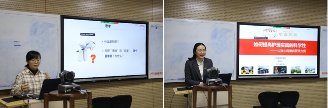 “科研助力临床护理实践”为本次科室学习的最后一个主题。由心内科护理学博士倪云霞、陈忠兰分别带来《如何畅通科研道路——聚焦“思维”与“方法”》、《如何提高护理实践的科学性》专题分享,随后同学们就慢病管理目前有哪些管理模式、护士发挥怎样的作用以及在哪些方面护士可以做的更好这些问题进行讨论分享,同时引导学生如何通过科研思维发现问题,改善临床实践。