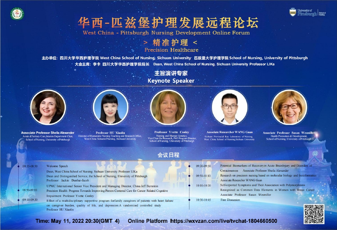 5月12日上午,“华西-匹兹堡护理发展远程论坛”在我院5G远程会议中心举行。匹兹堡大学伟德国际英国院长Jackie Dunbar-Jacob教授,UPMC国际高级副总裁兼中国区董事总经理Jeff Bernstein先生,伟德国际英国院长、本次会议主席李卡教授,以及两院多位护理与交叉学科专家出席本次论坛。论坛由匹兹堡大学伟德国际英国国际事务主任Lucinda Morgan女士,我院副院长张凤英教授和国际合作与交流主管邱晨博士共同主持,伟德国际英国外国语学院胡敏霞副教授、刘蓓老师担任同声传译。