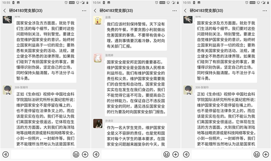 支部书记王武谈论自己的感受:国家安全对国家来说是非常重要的,作为党员更应该深谙其对我国的重要性,当国家安全受到威胁时,义无反顾的抗争是我们的义务。