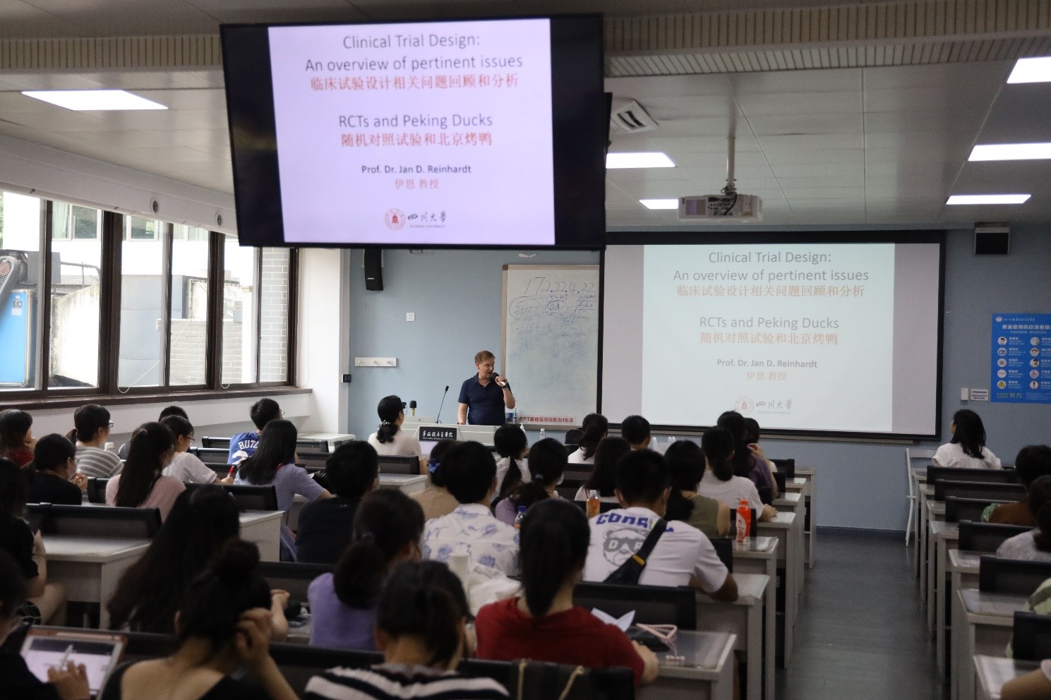 以随机对照试验为题,Prof. Jan D. Reinhardt将随机对照实验比喻为北京烤鸭,将随机对照实验中的各种变异因素形象化,激发了师生的学习兴趣。同时,他还对临床研究设计、研究方案、结果报告标准、临床试验质量评估工具、RCT实验设计的影响因素等作了详细的讲解。讲座后,我院毕业班本科生与研究生与Prof. Jan D. Reinhardt对相关问题进行了深入讨论。