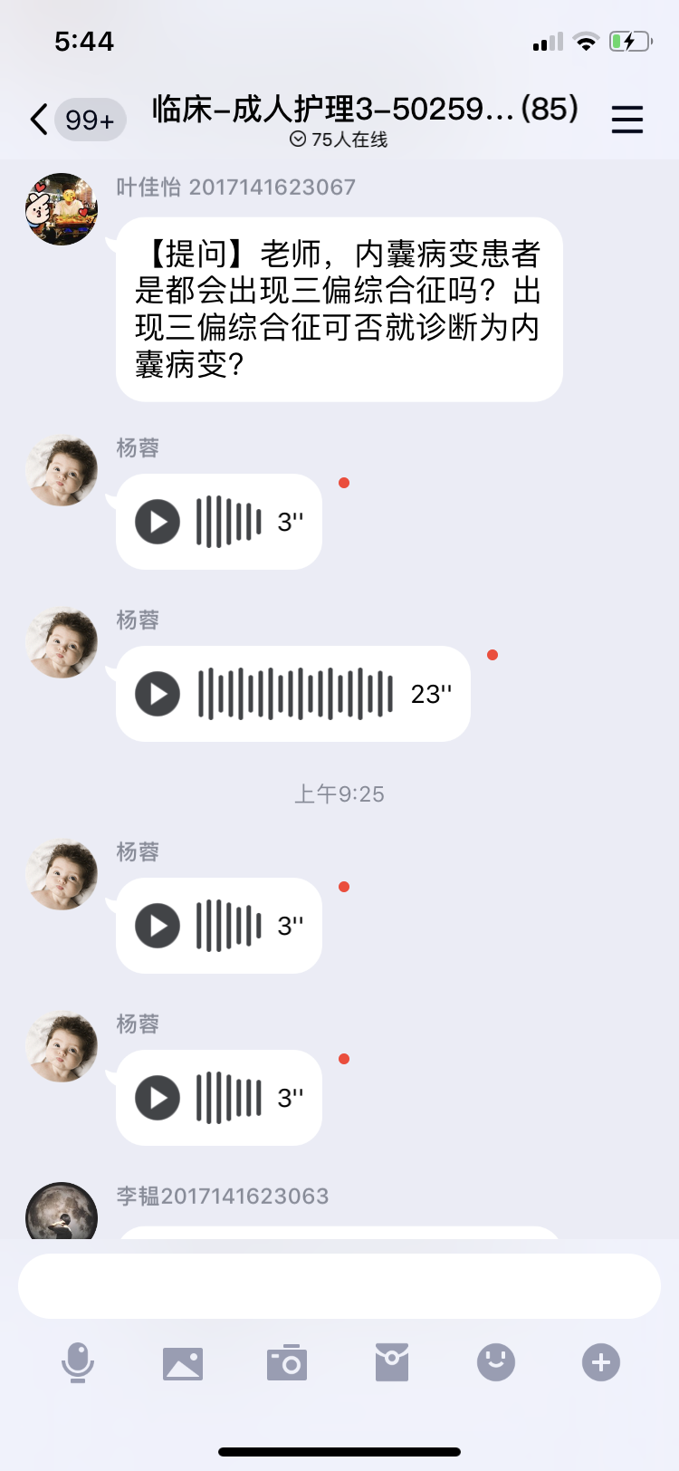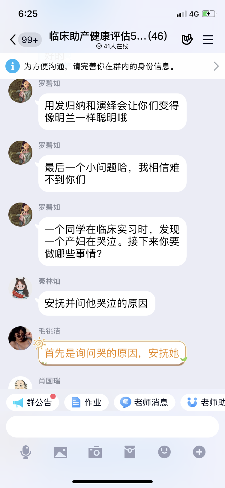 本堂课开始前,课程负责人谷波老师首先做了课程介绍,同学们接着在超星学习通中学习了《神经系统疾病病人的概述》中神经系统总论绪论,并围绕着神经系统头痛、意识障碍、感觉障碍、运动障碍等神经系统专科知识点展开了热烈的讨论,在QQ群里与杨蓉老师互动问答气氛热烈。