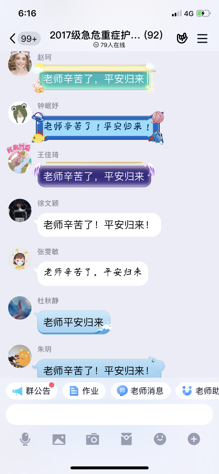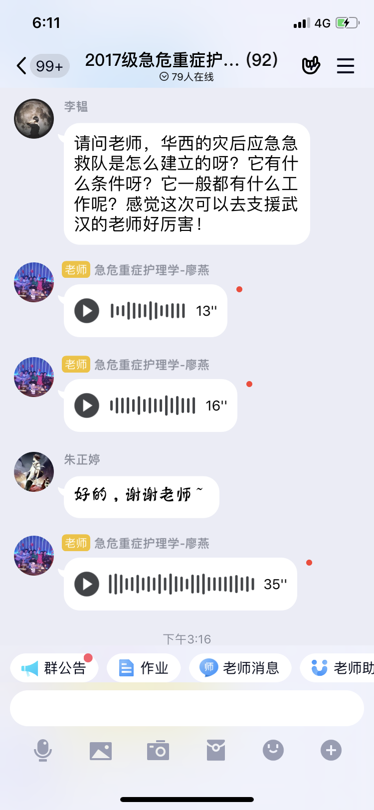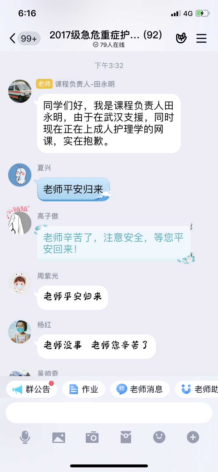在成人护理课程结束后,田老师还利用间隙到《急危重症护理学》在线教学串场,对同学们表达了作为课程负责人不能与同学们进行在线视频开课介绍的遗憾,同学们纷纷发言,希望老师平安归来。