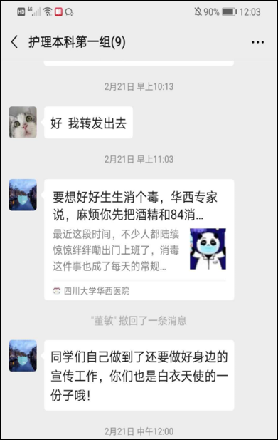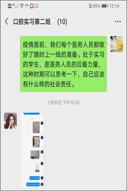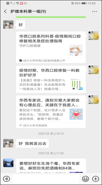 由于新冠肺炎导致的突发疫情对学生的学习和生活带来了很大的影响,有的学生更因所在区域疫情较为严重心里有些恐慌。教研室指示教学组长在教学群里将疫情信息准确传达给学生,同时教会学生新冠肺炎的基本知识、家庭防护的要点等以舒缓学生们的紧张心理提高应对能力。护理实习生是医务工作者的后备力量,在疫情面前除了不慌张还应该有所担当。因此教研室在教学中除了给予学生心理支持外还积极引导学生思考自己应有怎样的使命感。自疫情发生后,口腔医院老师不拍危险,承担了口腔急症患者的诊治工作,持续为公众推出防疫知识、口腔健康维护等科普文章,在疫情防控中贡献自己的一份力量。教学组老师在教学群中不断告诉学生们老师在做什么,怎么去做的,在致敬这些逆行的提灯天使们的同时,鼓励学生们做家庭、社区的宣传员,在科学抗疫时勇敢前行。