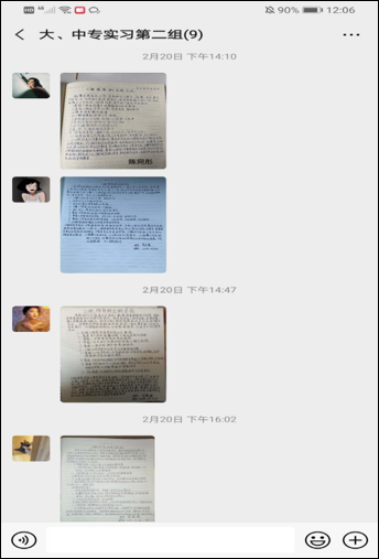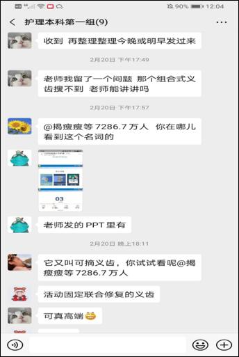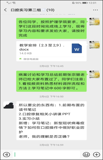 带教组长董老师、教学秘书张老师负责与护理本科实习生共同建立一个微信群作为学习交流的平台。老师在群里发布教学计划、教学要求,同学们按计划完成学习。学生每天在群里打卡学习、回答老师的问题;学生在学习中遇到的任何问题都可以在群里得到老师的及时解答。本科护理实习生有较强的学习能力,在线学习指导教师为学生提供了较多的参考文献索引供学生阅读、思考、总结。在线教学从2月3日开始到2月23日,两组实习同学都顺利完成了口腔部分的学习,作业完成良好。