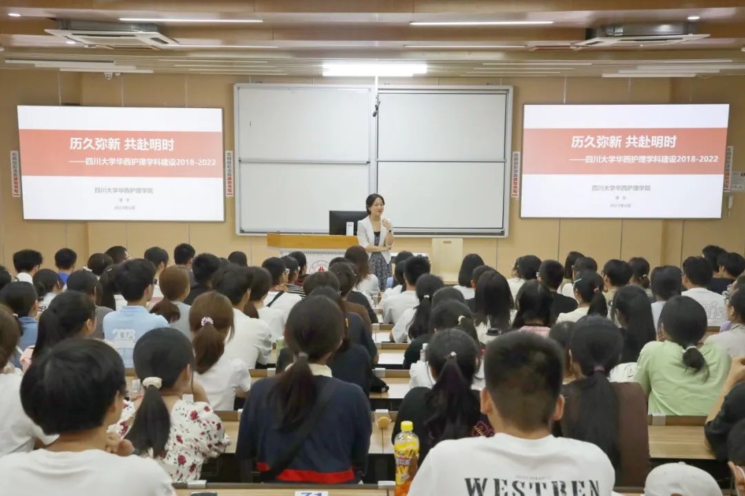 在题为《历久弥新,共赴明时》的课堂上,李卡教授以习近平总书记重要讲话精神和党的二十大报告为指引,围绕川大精神、华西精神讲述了伟德国际英国的百年历史,从现代护理学的诞生、护理人才培养、护理学科成果、对外交流与合作、优秀毕业生、学科发展趋势等方面向同学们讲解了护理学科内涵与专业建设情况。李卡教授通过深入浅出的讲述增强了同学们对川大文化、华西精神和护理专业的认识和理解,领略了护理学的魅力。护理新生应传承华西人 “忠诚、执着、朴实、奉献”的护理精神,要志存高远,服务国家大局;创新奋发,服务人民健康;坚守初心,厚植关怀服务,努力成为“仁爱、精业、优雅、大气”的优秀护理人才,一同努力建设“华西烙印、川大风格、中国顶尖、世界前列”的川大华西护理学科,为健康中国战略贡献华西护理的积极力量。