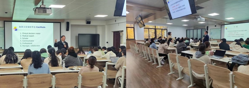 万学红教授全程英文讲授,从医学模式的演变入手,娓娓道来,层层推进,阐释了现代医学模式的演进、国际医学组织及其全球医学教育机构对医学生素质和能力的要求,以中国《本科医学教育标准》及胜任力培养举例,对医学生胜任力的要求等进行了详细阐述。万教授强调,护理学既包含医学科学,也包含社会人文,在学习中应培养好的专业素养和能力,同时要思考如何成为优秀的沟通者、管理者、决策者、教育者和研究者。课堂末尾的思考题“如何规划自己的能力培养”引发全体同学积极思考与互动。