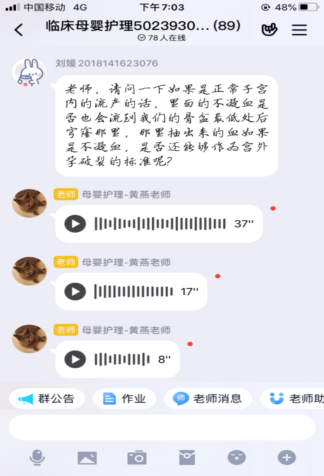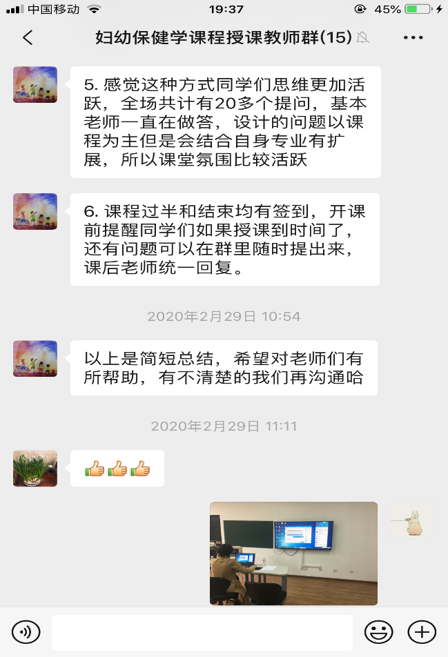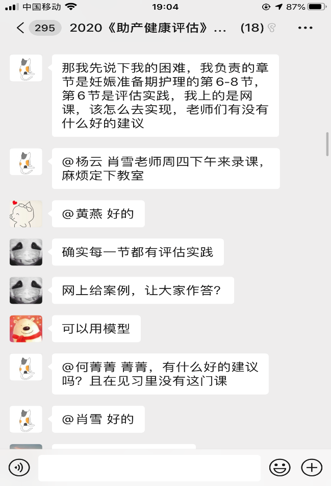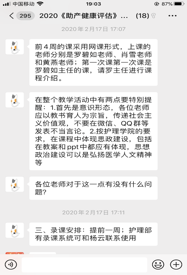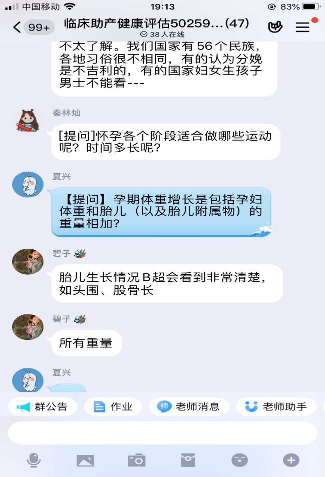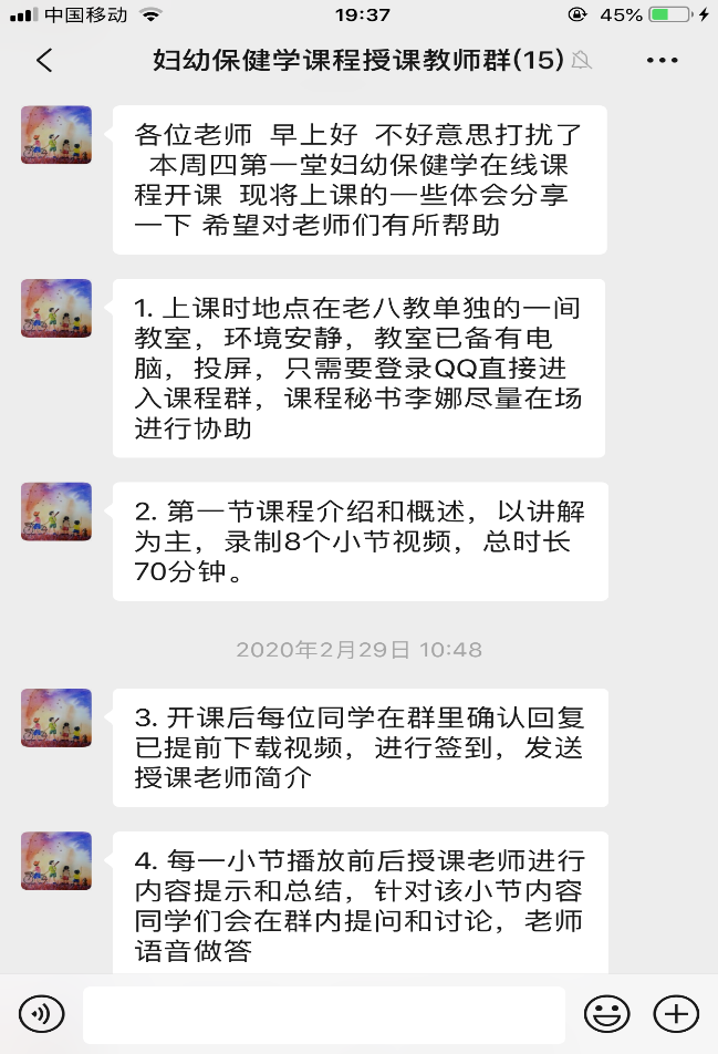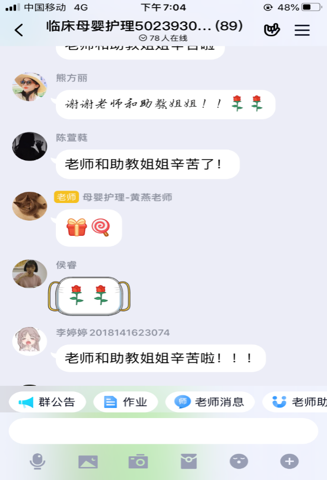 在接到学院进行线上教学的通知后,妇产科护理教研室的三个课程组第一时间作出响应,建立教师教学工作沟通群,就如何进行线上教学、采用哪种平台、各章节线上教学的实际困难等问题进行讨论,最终决定选用QQ群作为线上授课平台,教师提前采用各种录课手段进行课程的分段录制,课前将录课视频上传到QQ群,同学们提前下载,保证课程的顺利进行。