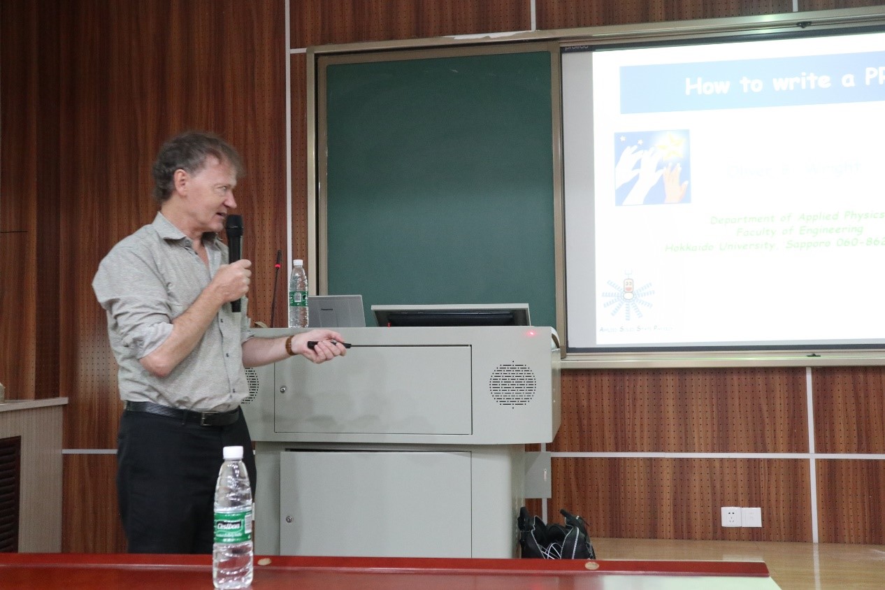 Wright教授是北海道大学的教授,曾在英国、法国、日本等企业与研究机构担任顾问,同时也是国际多个重要物理研究协会Fellow, 在物理界著名期刊Phys. Rev. Lett.、Phys. Rev. B等上发表论文百余篇。由于教授来自英国,且在论文撰写方面有其独特的见解,本次讲座教授为大家分享了如何写好高水平学术研究论文。