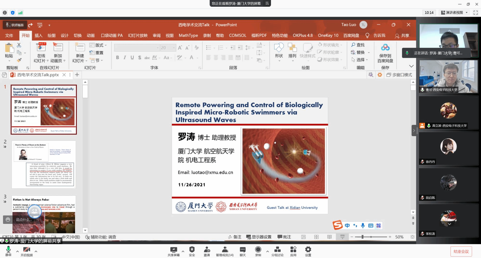 (通讯员 高立波)11月26日上午,应开云kaiyun官方网站高立波的邀请,厦门大学航空航天学院机电工程系助理教授应邀在线上作了题为《Remote Powering and Control of Biologically Inspired Micro-Robotic Swimmers via Ultrasound Waves》的学术报告。本次报告因疫情原因改为线上,高立波,王明智,曹可等测控系师生参加,高立波副教授主持。