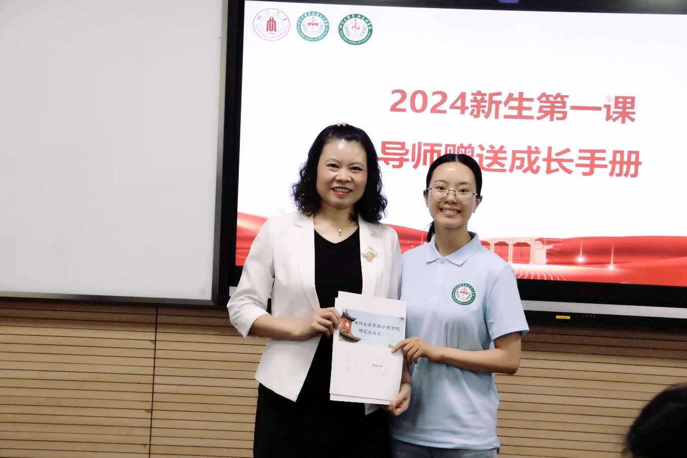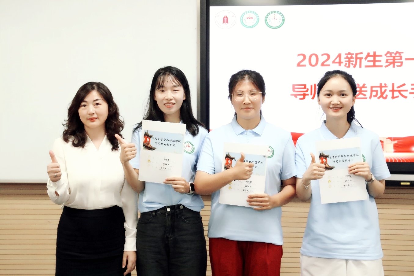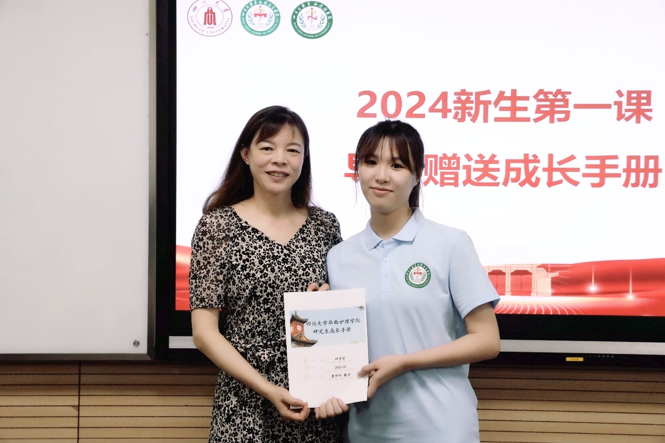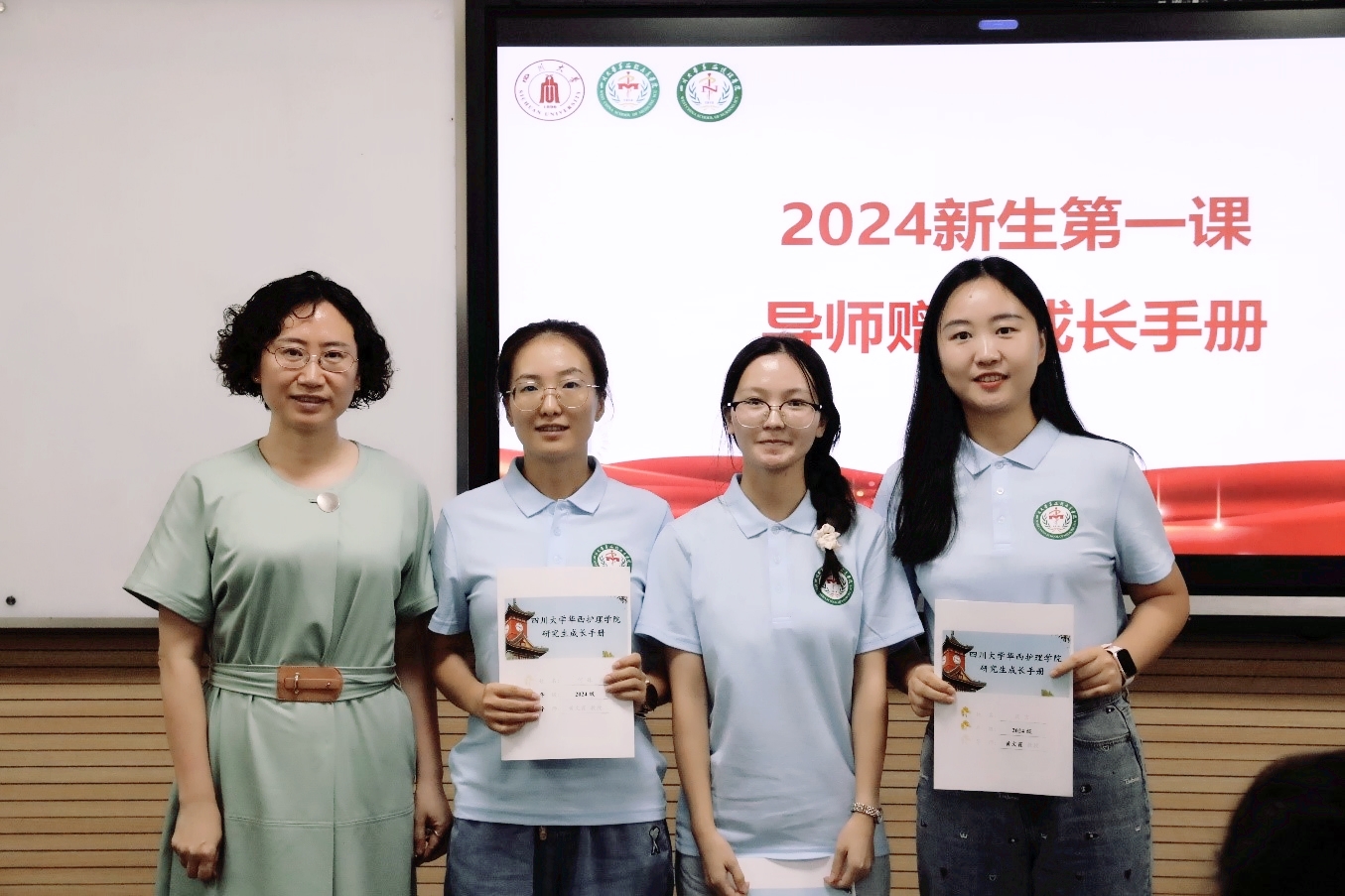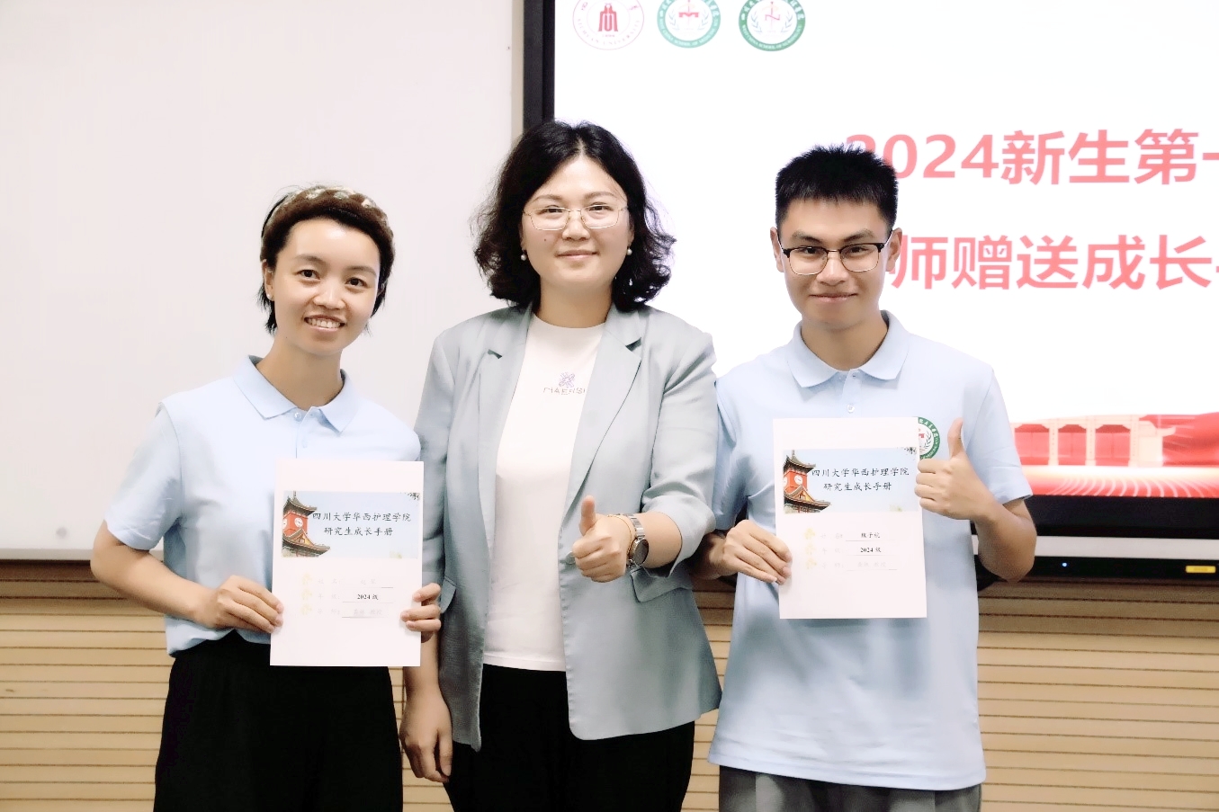 在师生互动环节,每一位新生进行了自我介绍并述说未来的短期目标和长期目标,研究生导师为每一位学生写下入学寄语并赠送成长手册。