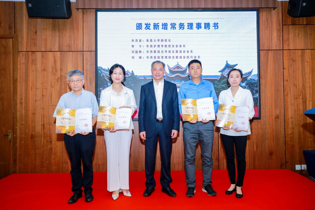 南昌大学副校长辛洪波,伟德国际英国校友会会长李卡,华西眼视光校友联谊会会长刘陇黔,华西医院管理校友联谊会执行会长刘晖被增补为校友会第一届常务理事会理事,川大华西临床医学院校友会会长张伟为增补的常务理事颁发了聘书。