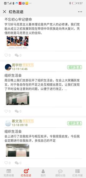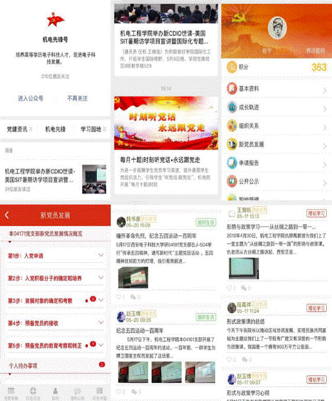 5.利用信息化手段促进基层党组织建设效率提升。依托学院党建微信公众平台“机电先锋号”搭载的“一云台两专栏四推送”---即“党建云”智慧管理系统平台,“党建资讯”、“特色栏目”两个专栏将党章党纪党规和专题教育的相关内容融于其中以及每月推送四次党建要闻宣传党的政策、传达上级精神、交流“不忘初心、牢记使命”主题教育的工作经验。特别是通过“机电先锋”党建云智慧管理系统平台大大提高了基层党组织的工作效率:通过“党费收缴”实现党费一键“秒交”,每月按时交党费,永远不忘共产党员身份;通过“红色足迹”方便分享党员个体的学习体会和成长经历,拉近了心与心的距离;通过“通知公告”把中央要求、上级文件、工作安排轻松放到每个党员口袋里;通过“红色书屋”把成千上万本理论书籍摆到大家面前,网上下单分分钟送到;会议通知、电子签到、党务公开、组织建设一个个功能真正做到整合资源、充实数据、科学运用、优化机制,营造“红色空间”党建氛围,切实提升了学院基层党建工作的质量。今年主题教育以来为解决党员发展中的规范化问题我们新上线“党员发展”模块将党员发展的“五大步25小步”融入系统实现线上线下党员发展全流程辅导,全过程纪录。我院《打造“智慧党建”创新平台,提高基层党建工作水平——以“机电先锋号”创新平台建设为例》也荣获了校十佳党建特色案例。