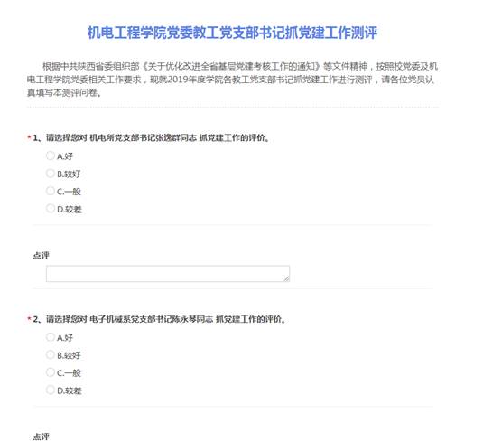 针对学生支部,学院以线上多角度测评、线下考核表进档案等方式,开展述职考核工作。学院党委分别制作了《机电院学生党支部工作年终考核测评(发支部党员)》、《机电院学生党支部工作年终考核测评(发联系党委委员)》、《机电院学生党支部工作年终考核测评(发党务干事)》三份线上考核问卷,结合各学生党支部工作实际,从支部日常工作开展情况、战斗堡垒作用发挥情况等各方面,向支部党员、联系党委委员以及学院党务干事征求评价意见,形成线上评价结果。召开学生党总支支委会,对照三类线上评价结果及党支部成员党费交纳情况、活动参与情况等方面由学生党总支支委委员填写《2019年度机电院学生党支部考核测评问卷(发学生党总支支委)》进行打分,提交学院党委会形成最终评价结果,评价结果记录入《开云kaiyun官方网站学生党支部委员年度考核表》,并将考核表放入支委委员个人档案。