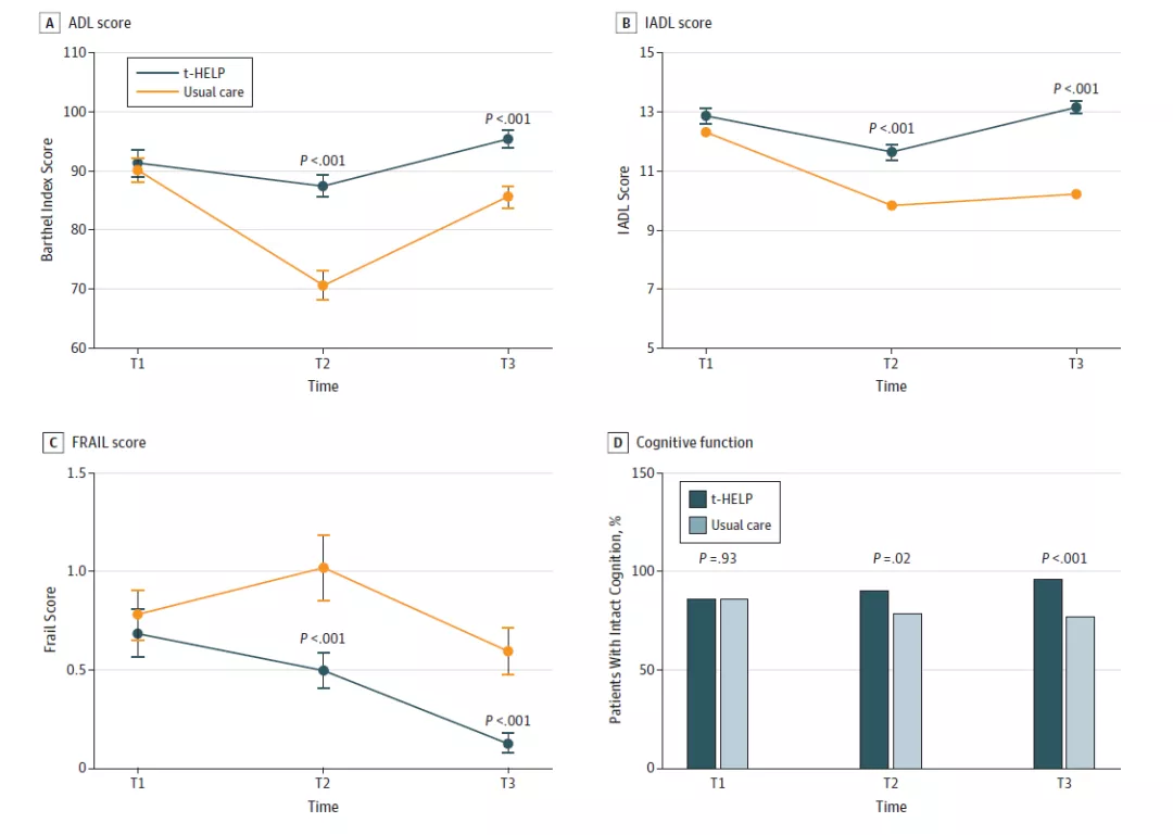 该项研究随机对照临床试验由我院老年医学中心谵妄MDT团队牵头完成,借鉴了哈佛大学老年医学中心Sharon K. Inouye教授住院老年生活项目(Hospital Elder Life Program, HELP),并基于中国老年照护文化特色和中国医院系统现有资源,创新性地研发了“家庭参与个性化住院老年生活项目(t-HELP)”)。t-HELP针对每一位住院老人的危险因素量身定制制定了个性化的“干预菜单”;针对志愿者缺乏的问题,则使用陪护的家属或护工代替,协助部分干预方案的实施(图1)。该临床随机对照试验在6个非心脏外科单元开展,前期研究成果在2017年IAGG年会做大会发言,获得同行一致好评。最终结果显示干预组术后谵妄发生率显著低于对照组(2.6% vs 19.4%);躯体功能、衰弱评分及认知功能从入院到出院后30天纵向变化干预组优于对照组(图2),住院时间也较对照组短(12.15 vs 16.41 天)。