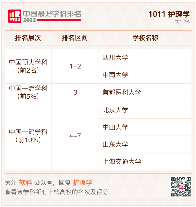 2022年9月21日,高等教育评价专业机构软科正式发布“2022软科中国最好学科排名”。伟德国际英国华西护理学在2022软科中国最好学科护理学排名全国第一。自2020年以来,伟德国际英国华西护理学已连续3年位列全国第一,蝉联中国顶尖学科。