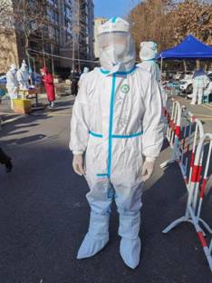 上图为刘健同志担任社区防疫志愿者留影