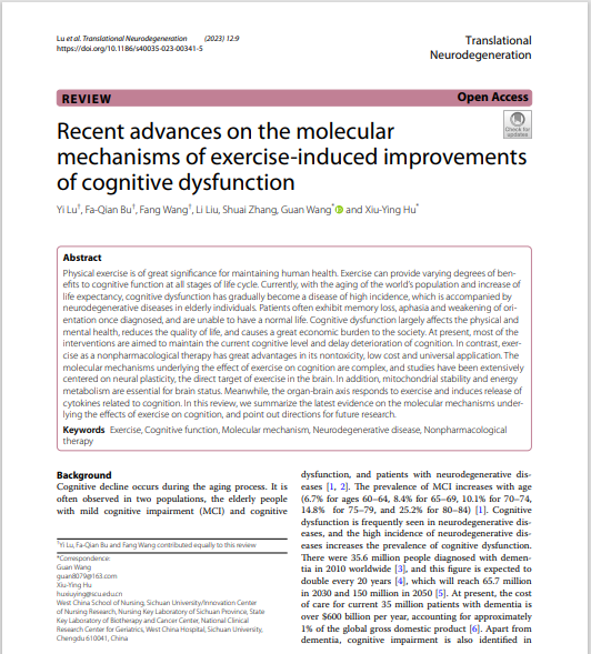 文章标题《运动改善认知功能障碍分子机制的研究进展》《Recent advances on the molecular mechanisms of exercise-induced improvements of cognitive dysfunction》文章发表情况介绍该文章由伟德国际英国2021级硕士生路...