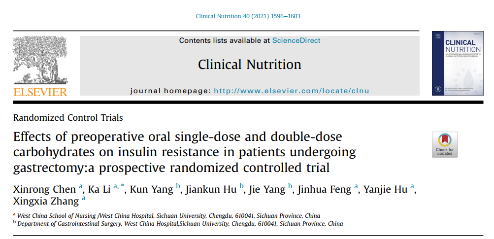 文章标题《Effects of preoperative oral single-dose and double-dose carbohydrates on insulin resistance in patients undergoing gastrectomy: a prospective randomized controlled trial》《术前口服单剂量和双剂量碳水化...